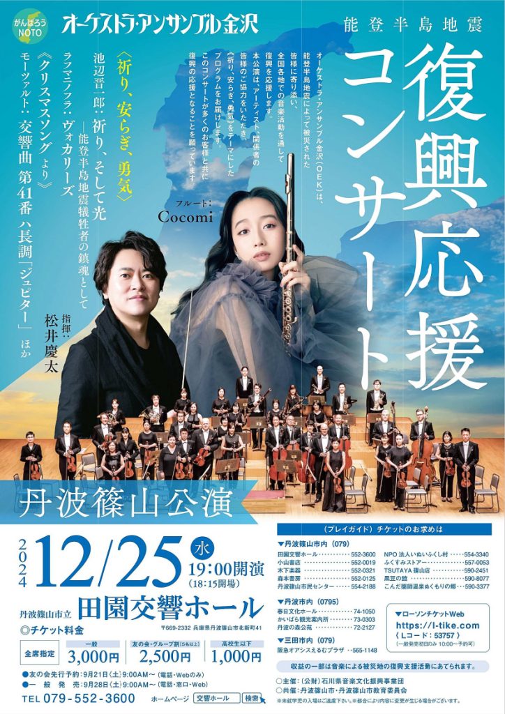 能登半島地震の復興応援コンサートが12月25日(水)、丹波篠山市立田園交響ホールで開かれます。音楽の力で被災地や被災者を応援し勇気づける公演で、9月から石川県内外の22会場で開催しています。