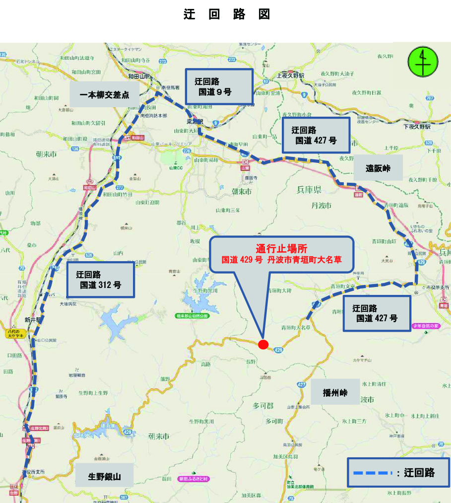 朝来市生野町黒川と丹波市青垣町大名草を結ぶ一般国道429号(青垣峠)が、落石防護柵の設置工事のため下記の期間で通行止めとなります。ご注意ください。