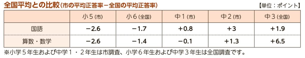 市内の小学5年から中学3年の児童生徒を対象にした「全国学力・学習状況調査」と、市の「学力・生活習慣状況調査」の実施結果が公表されました。中学3年生の数学で全国平均を6.5ポイント上回りましたが、小学6年生の国語ではマイナス1.7ポイント、算数はマイナス1.4ポイントとなっています。