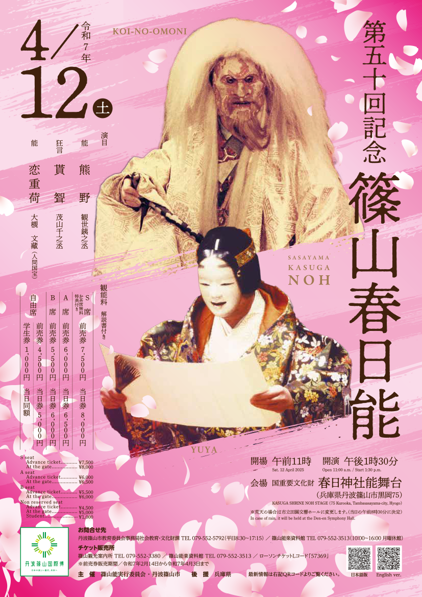第50回目となる篠山春日能が令和7年4月12日(土)、国指定重要文化財の春日神社能舞台(丹波篠山市黒岡)で開催されます。開演は13時30分(開場は11時)から。入場チケットの前売券は令和7年4月3日まで販売中です。