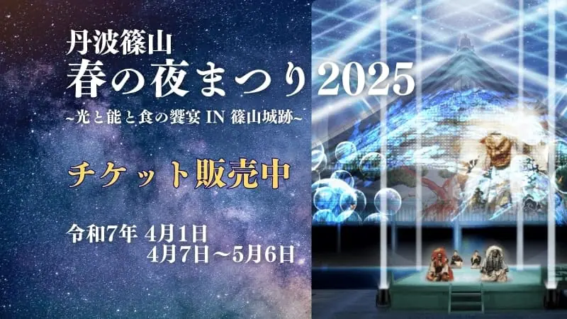 丹波篠山国際博のオープニングイベントとして、「丹波篠山 春の夜まつり2025~光と能と食の饗宴 in 篠山城跡~」が実施されます。4月7日(月)から5月6日(火・祝)にかけては、能楽師の映像を交えて光を演出するプロジェクションマッピング公演を篠山城跡で開催します(4月14、21、28日は除く)。日本最大級規模のライトアップになるようです。丹波篠山の四季をうたった詩「無為郷愛(むいきょうあい)」も上映されます。幻想的な春の夜をお楽しみください。