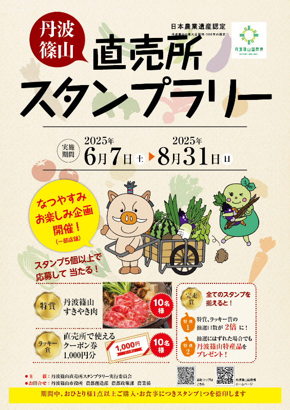 市内の直売所11カ所でスタンプを集めて賞品を当てる、丹波篠山「直売所スタンプラリー」が8月31日(日)まで実施されています。直売所で農産物など1点以上購入するか、食事をするとスタンプ1つが捺印され、5つ以上集めると抽選に応募できる仕組み。特賞は丹波篠山すきやき肉(10人限定)、ラッキー賞は参加直売所で使える1000円分クーポン券(10人限定)が当たります。