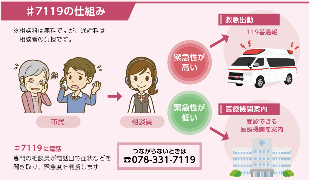 「病院に行くべきか」「救急車を呼ぶべきか」「応急手当の方法は」など対応に迷った際、#7119にダイヤルすると看護師や相談員が電話口で傷病者の状況を聞き取り、緊急性の有無や、病院を受診する必要性があるかなどを判断します。特に緊急度が高い場合はそのまま119番に転送し、緊急性が高くないと判断された場合は適切な医療機関や受診のタイミングについてアドバイスをします。ぜひご活用ください。