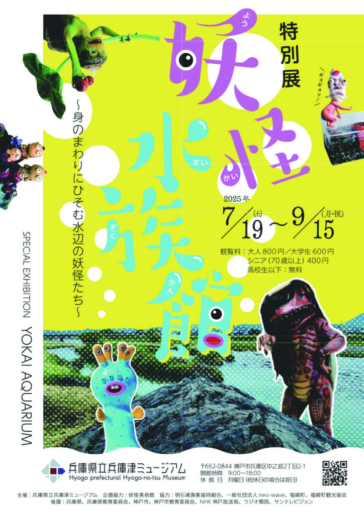 兵庫県立兵庫津ミュージアムでは、特別展「妖怪水族館~身のまわりにひそむ水辺の妖怪たち~」が7月19日(土)から開催されます。県内に伝わる妖怪伝承から瀬戸内・小豆島にある妖怪美術館が収集する現代妖怪まで、妖怪の魅力や物語を楽しみながら環境保全やSDGsを考えるきっかけを提供するのがコンセプトです。福崎町の人気者河童・ガジロウとの交流会もあり、サインがもらえるとか。ナイトミュージアムでの肝だめし、怪談会などもあるので、夏休みなどに家族そろってご来場ください。