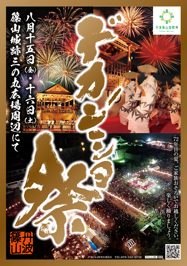 今年もいよいよやってきました! 丹波篠山が全国に誇る夏の大イベント「デカンショ祭」が8月15日(金)と16日(土)の両日、篠山城跡三の丸広場周辺で開催されます。巨大ヤグラをシンボルにした1000人規模の総踊りをはじめ、広場内やその西側には約180店の屋台が集結するほか、市内の小中高生によるヤグラでの吹奏楽演奏、打ち上げ花火(両日)などイベントも盛りだくさん。市内と会場駐車場をつなぐ無料バスも運行します。江戸時代から歌い継がれた民謡「デカンショ節」で、親子そろって賑やかに楽しみましょう!