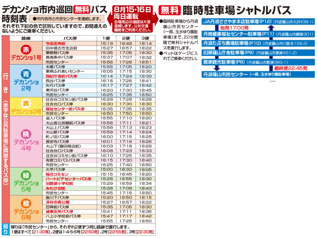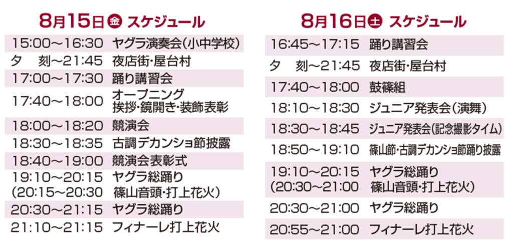 日時)令和7年8月15日(金)15時~21時15分(予定)、16日(土)16時45分~21時(予定)