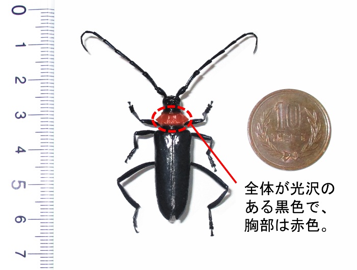 クビアカツヤカミキリは体長22~38ミリ。全体は光沢のある黒色で前胸が赤色なのが特徴です。サクラやモモ、ウメなどバラ科の木を好み、樹木の中に卵を産み付けて幼虫が内部を食い荒らし、木が枯死したり、倒木したりするケースが相次いでいます。特にサクラの大敵とされ、国内では2012年に愛知県で初確認されて以降、全国に分布を広げています。
