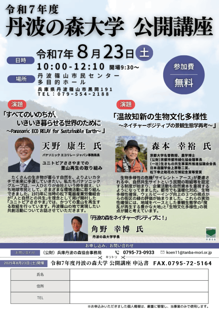 丹波の森大学は、令和7年度の公開講座を8月23日(土)に丹波篠山市民センターで開催します。人と自然と文化が調和した地域をめざす同大学の実践学習で、ユニトピアささやまの里山再生や農学博士による景観生態学の講義など興味深い話題が紹介されます。誰でも無料で参加できますので、ぜひご来場ください。
