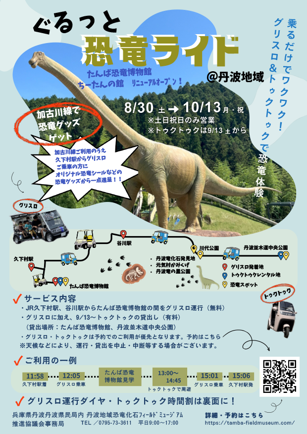 大阪・関西万博に合わせ、二次交通を導入したものです。駅からグリスロでたんば恐竜博物館に向かい、見学後はトゥクトゥクで丹波竜化石の発見地や元気村かみくげなどを周遊してもらう仕組みです。運行ダイヤなど詳細は下記の専用サイトを参照してください。