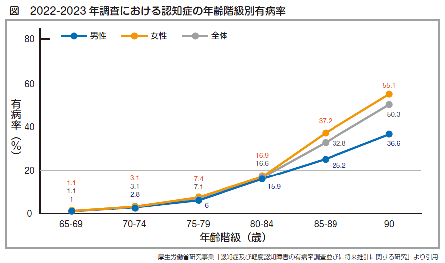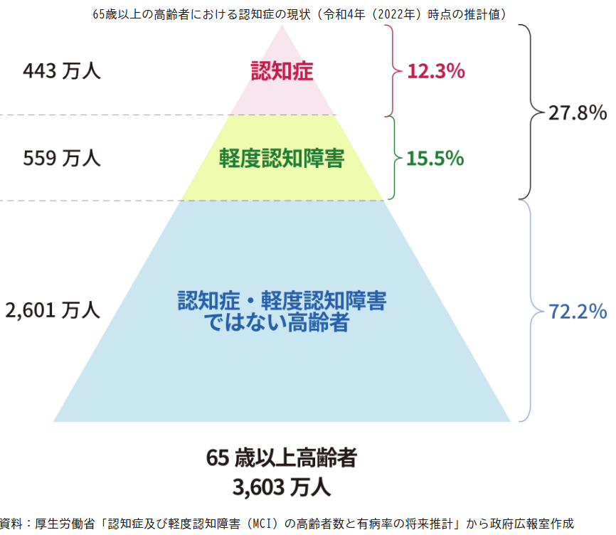 認知症は、さまざまな病気で認知機能(記憶、判断力など)が低下して社会生活に支障をきたした状態を指します。国内の65歳以上を対象にした令和4年度調査によると、3人に1人が認知機能にかかわる症状があるとされ、発症年齢が平均54歳で男性に多い若年性認知症もあり、誰もがなり得ると考えられています。完全な治療法はありませんが、早い段階で発見して適切な処置をすれば進行を大きく遅らせることが可能です。この機会に認知症に見られる具体の症状を把握し、心当たりがあれば早めにかかりつけ医や専門機関に相談してください。