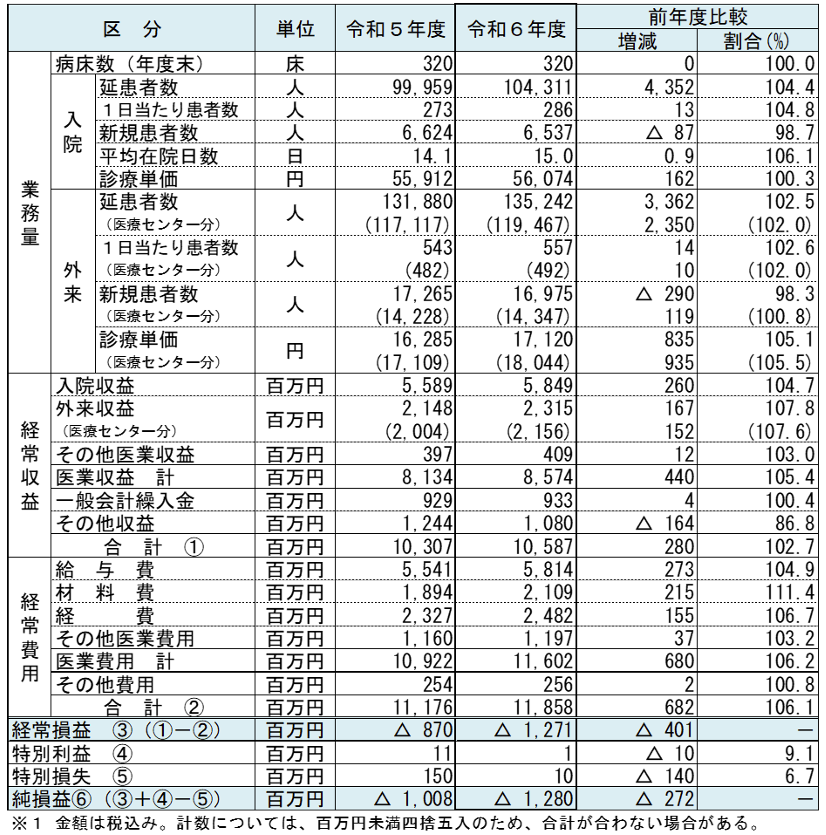 同センターで令和6年度に受け入れた入院患者数は10万4311人で、前年度と比べて4352人増加しました。外来患者は延べ13万5242人で前年度比3362人増となり、1日あたりの患者数は557人となっています。しかし医業にかかるコスト(経常費用)は収益を上回って赤字状態が続いており、6年度も物価高騰などで多くの経費が微増している状況です。今後、救急を含めたさらなる患者の受け入れに努め、地域医療との連携強化や診療材料の節減に取り組んで健全運営をめざしていかねばなりません。