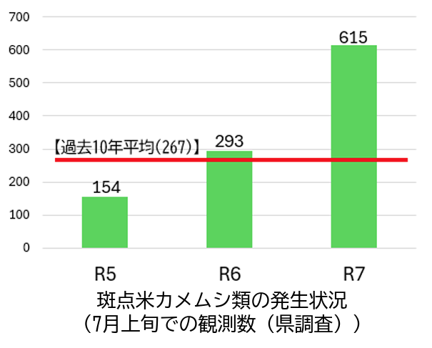 また、コメの天敵と言われ、全国的な高温で大量発生しているカメムシ(班点米カメムシ類)の対策として、集落単位で実施する追加防除の経費を補助する緊急事業を実施します。これも9月補正予算に計上しました。県が推奨する回数の防除を行ったほ場が対象で、1集落または約20ヘクタール以上の面積への一斉防除が要件。防除の農薬費用、防除委託費などに、10アールあたり1000円が補助されます。財源は国庫を活用し、今年8月7日以降の追加防除が対象となります。