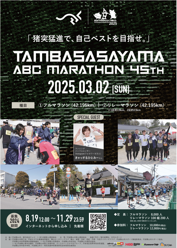 猪突猛進で、自己ベストを目指せ――。第46回丹波篠山ABCマラソンが、令和8年3月1日(日)に開催されることが決まりました。開催されます。フルマラソンと42.195キロを二人で走るリレーマラソンの2種目があり、参加するランナーの募集を開始しています。公式サイトから申し込みができ、期間は12月20日(土)まで。先着締切です。