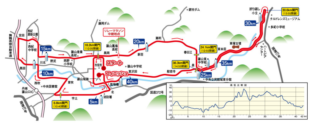 今回から制限時間が6時間30分に延長されたほか、リレーマラソンも初導入。一人目の第1区は19キロ、二人目の第2区は23キロを走って二人で完走をめざします。ペースランナーのサポートもあり、コース上とフィニッシュ地点で名物しし汁がふるまわれるのが特徴。参加ランナーには記念品の大会ユニフォーム、完走者は丹波焼による完走メダルが贈られます。なお、京阪神からの来場はマラソンバスが便利です。