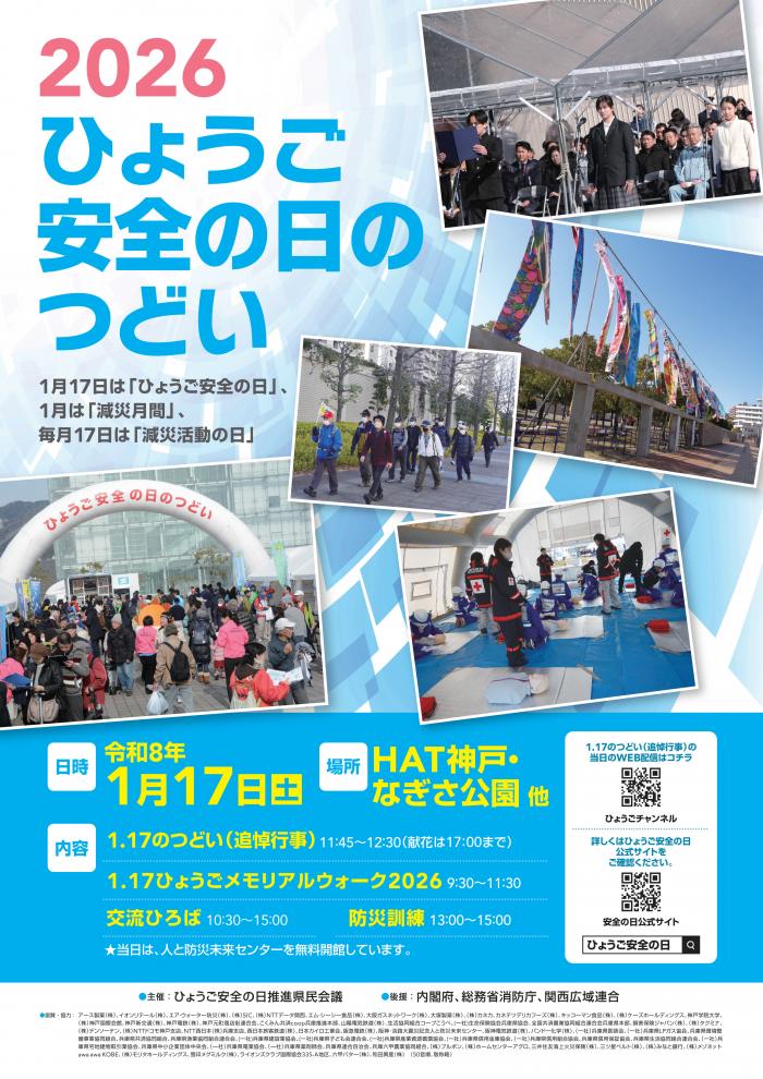 1995年1月17日に発生し、6434人の方々が亡くなった阪神・淡路大震災の経験と教訓を伝える「ひょうご安全の日のつどい」が令和8年1月17日(土)、神戸市中央区のHAT神戸で実施されます。震災から31年目を迎える今回は、慰霊のモニュメント前で献唱や献花などの追悼行事が行われるほか、被災した地域を歩く約4キロの「1.17ひょうごメモリアルウォーク2026」(要事前申込)、交流ひろば(なぎさ公園)での防災体験学習、炊き出し、防災訓練などが実施されます。
