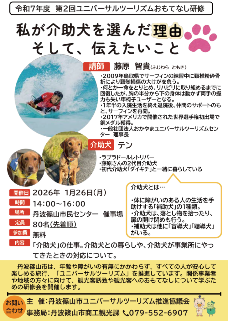 ユニバーサルツーリズム(UT)を知り、心を込めたサービスについて学ぶ「第2回ユニバーサルツーリズムおもてなし研修」が令和8年1月26日(月)、丹波篠山市民センターで開催されます。今回のテーマは「介助犬」です。誰でも無料で参加できますので、ぜひ足をお運びください。