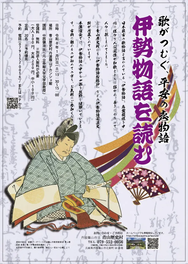 和歌にまつわる短編の歌物語集「伊勢物語」をテーマにした古典講座「歌がつむぐ、平安の恋物語 ―伊勢物語を読む―」が令和8年1月31日(土)、青山歴史村 丹波篠山デカンショ館で開催されます。受講料は無料(別途入館料が必要)で、予約優先なので事前に申し込むことをお勧めします。