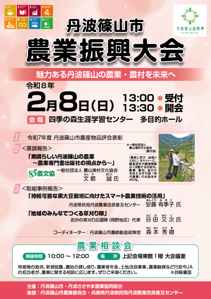 農業や食に関する月刊誌「現代農業」を出版する一般社団法人農山漁村文化協会の文箭(ぶんや)誠氏が基調報告するほか、スマート農業技術を活用した黒大豆栽培などの取り組み事例も紹介される予定です。