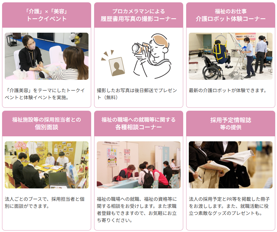 県内の102法人がブースを出展して会社概要や事業内容を紹介しており、その場で採用担当者との個別面談ができます。履歴書は不要で、服装も入退場も自由。福祉の職場に関する各種相談コーナー、介護ロボット体験コーナー、履歴書用写真の撮影コーナーもあるほか、「介護美容」をテーマにしたトークイベントも開催されます。