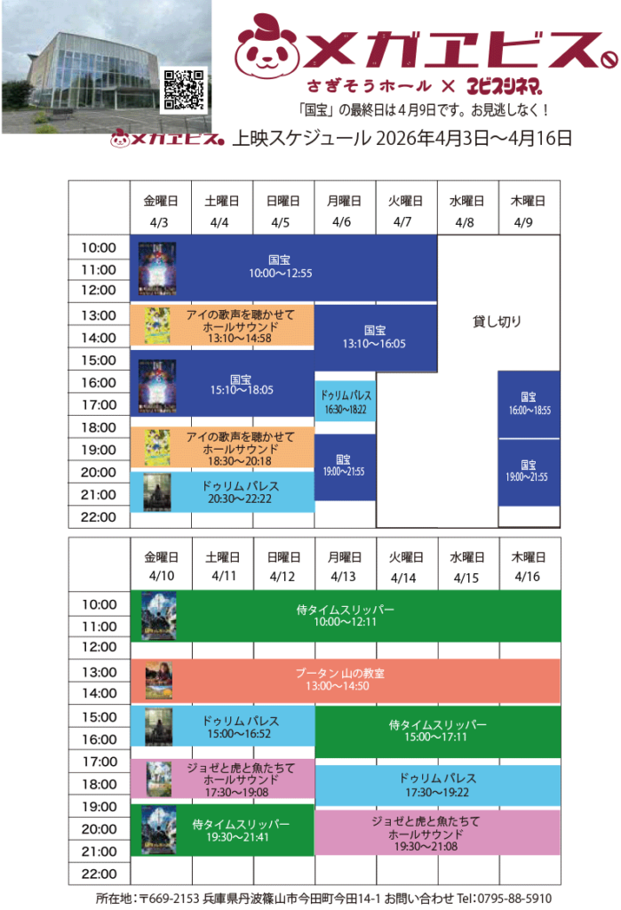 昨年4月、丹波篠山市に55年ぶりに復活した映画館「メガヱビス。」で、春季開業がスタート。4月3日から16日にかけて、話題作の「国宝」や「侍タイムスリッパ―」などがラインナップされています。ぜひ来館ください!